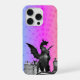 Phone case of a black and white dragon statue on a rainbow background.
