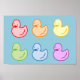 A cute and kitchy retro design features little duckies in rainbow colours.