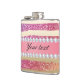 The flask itself is fine. It’s a cheap flask, obviously bought in bulk, however am prepared to overlook that. Given that it is a personalized item, I would have liked to have seen gift boxing instead of the generic packaging. Terrible printing, and/or quality. It’s a cheap, tacky vinyl. It is not cut straight and is also applied in a way that it is overhanging the bottom, causing the glue to catch on items and it will eventually roll and tear, damaging the wrap.