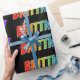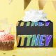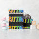 This vibrant, fun, multicolored wrapping paper design features the common first name "BRITTNEY" having a colourful rainbow spectrum like colouring pattern. The background is coloured black. Colourful wrapping paper like this might be a fun way to wrap a gift being given to somebody named Brittney. [~Z0000354]