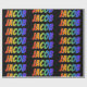 This fun, multicolored, vibrant wrapping paper design features the common first name "JACOB" having a colourful rainbow spectrum like colouring pattern. The background is coloured black. Colourful wrapping paper like this might be a fun way to wrap a gift or present being given to somebody named Jacob. [~Z0000354]