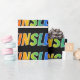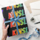 This vibrant, exciting, multicolored wrapping paper design features the common first name "KINSLEY" having a colourful rainbow spectrum gradient like colouring pattern. The background is coloured black. Vibrant wrapping paper like this might be a fun way to wrap a gift or present being given to somebody named Kinsley. [~Z0000354]