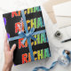 This fun, vibrant, multicolored wrapping paper design features the common first name "RICHARD" having a colourful rainbow spectrum inspired colouring pattern. The background is coloured black. Exciting wrapping paper like this might be fun to use when giving a present or gift to somebody named Richard. [~Z0000354]