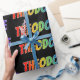 This vibrant, exciting, fun wrapping paper design features the common first name "THEODORE" having a colourful rainbow spectrum like colouring pattern. The background is coloured black. Vibrant wrapping paper like this might be a fun way to wrap a present or gift being given to somebody named Theodore. [~Z0000354]