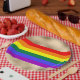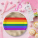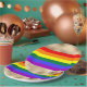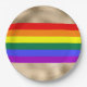 These colourful party plates feature an LGBTQ Pride theme. The striped rainbow Pride flag covers the lower portions of the box. A gold foil pattern covers the top portion.
