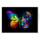 Rainbow, luminous, artistically painted monarch butterfly with bouquet of iridescent, bright, luminescent roses on black background. Rainbow butterfly.