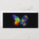 Rainbow, luminous, artistically painted monarch butterfly with bouquet of iridescent, bright, luminescent roses on black background. Rainbow butterfly.