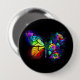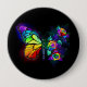 Rainbow, luminous, artistically painted monarch butterfly with bouquet of iridescent, bright, luminescent roses on black background. Rainbow butterfly.