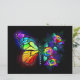 Rainbow, luminous, artistically painted monarch butterfly with bouquet of iridescent, bright, luminescent roses on black background. Rainbow butterfly.