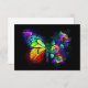 Rainbow, luminous, artistically painted monarch butterfly with bouquet of iridescent, bright, luminescent roses on black background. Rainbow butterfly.