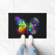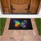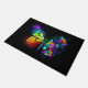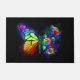 Rainbow, luminous, artistically painted monarch butterfly with bouquet of iridescent, bright, luminescent roses on black background. Rainbow butterfly.