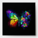 Rainbow, luminous, artistically painted monarch butterfly with bouquet of iridescent, bright, luminescent roses on black background. Rainbow butterfly.