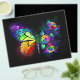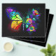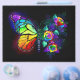 Rainbow, luminous, artistically painted monarch butterfly with bouquet of iridescent, bright, luminescent roses on black background. Rainbow butterfly.
