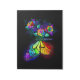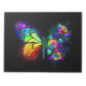 Rainbow, luminous, artistically painted monarch butterfly with bouquet of iridescent, bright, luminescent roses on black background. Rainbow butterfly.