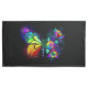 Rainbow, luminous, artistically painted monarch butterfly with bouquet of iridescent, bright, luminescent roses on black background. Rainbow butterfly.
