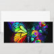 Rainbow, luminous, artistically painted monarch butterfly with bouquet of iridescent, bright, luminescent roses on black background. Rainbow butterfly.