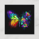 Rainbow, luminous, artistically painted monarch butterfly with bouquet of iridescent, bright, luminescent roses on black background. Rainbow butterfly.