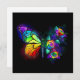 Rainbow, luminous, artistically painted monarch butterfly with bouquet of iridescent, bright, luminescent roses on black background. Rainbow butterfly.