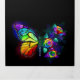 Rainbow, luminous, artistically painted monarch butterfly with bouquet of iridescent, bright, luminescent roses on black background. Rainbow butterfly.