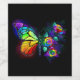 Rainbow, luminous, artistically painted monarch butterfly with bouquet of iridescent, bright, luminescent roses on black background. Rainbow butterfly.