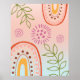Transform your space with this stunning abstract boho poster wall print, designed to bring warmth and charm to any room. This captivating artwork features colourful floral designs, including vibrant pink flowers and lush green leaves, intertwined with flowing lines and a whimsical boho rainbow. The soft pink and blue background provides a dreamy, serene backdrop, enhancing the vibrancy of the floral and geometric elements.