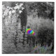 Does visiting a garden make you happy? This is a happy black--white photo of a garden with a happy rainbow twist. The trees and flowers appear almost monochromish, mostly black-and-white with slightly coloured hues. The garden visitor, sitting on a bench, appears to be dressed in vivid rainbow colours. This image is derived from an original photograph of a beautiful botanical garden, with digital filters applied to give the visitor a shirt of many colours. This decorative tile a a reminder of summer gardens that can complement your kitchen or dining decor.