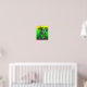 Decorate your walls in style with this unique, colourful art poster taken from an acrylic painting. In this whimsical abstract artwork, this rainbow coloured cat, composed of multicolored geometric shapes in every colour of the rainbow, sits on a brown surface against an ombre green and yellow background. She has one blue eye and one green eye, as well as a red collar with a golden bell.