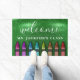 Emerald green faux glitter background seems to sparkle. Rainbow coloured crayons glitter in hot pink, purple, blue, turquoise, green, gold, orange, and red. Bold white text reads "welcome" in chalkboard font. Easily update the teacher's name or classroom title. Available in many other sparkly background colours and designs.