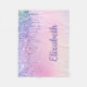 Cute fleece blanket featuring rainbow faux dripping glitter against a pink background. Personalise with her name in purple script.