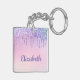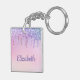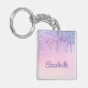Girly personalised keychain featuring rainbow-coloured faux dripping glitter down a pink background. Personalise with your name in purple script.