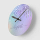 Girly princess clock for her room with rainbow-coloured faux dripping glitter down a background of purple, pink, blue, green and yellow. Personalise with her name in a stylish trendy purple script with swashes.