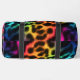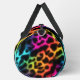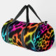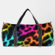 This image displays a duffel bag featuring a captivating leopard print design where the spots appear to be outlined with a vibrant, glowing rainbow effect. The "fur" within the spots transitions smoothly through a spectrum of colours including blue, green, yellow, orange, pink, and purple, creating a striking contrast against the dark, possibly black, background. The bag has black carrying straps. This unique and eye-catching design gives the duffel bag a dynamic and playful look, perfect for adding a pop of colour and personality to any outing.