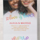 Cute and romantic all in one wedding invitation for a gay wedding or lesbian wedding or lgbtqa wedding where love is love is written in a cute and charming script and coloured with a rainbow gradient and the wedding wording is written in rainbow colours.