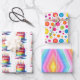 Three sheets of birthday wrapping paper with rainbow themes. One has a rainbow birthday cake, one has rainbow polka dots and the third has rainbow stripes.