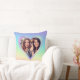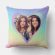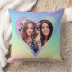 This custom throw pillow features a Valentine love theme with a photograph heart frame. The background is a rainbow gradient pattern with holographic rainbow style frame. A sample photo of best friends is placed in the centre.