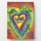 The words "Love" and "Spirit" are at the centre of a yellow gold heart. Rainbow colours radiate out from the heart with different inspirational words: Serenity, Grace, Faith, Courage, Happy, Peace, Hope, Friends, Fun, Laugh, Strength, Joy. Art was painting on canvas. Inspirational artwork by Laurel Latto for DonnaBellas Angels.