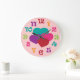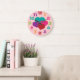 This fun design features clock numbers in a rainbow of colours, and four hearts in teal, purple, pink and red colours. To personalise the clock, click on the Customise It button. This clock works makes a great décor item for a girls room.