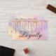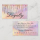 This girly and glamourous customer loyalty business card is perfect for a stylish and trendy professional businesswoman. It features faux printed sparkly rainbow colour glitter drips on top of a holographic iridescent foil background. The typography is an elegant cursive script with a modern serif font to match. The colour scheme includes pink, peach, blue, purple, gold, and coral. It's chic, pretty, unique, and luxurious; the perfect way to advertise your business and stylise your marketing and advertisement material for your customers.