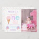 This cute invitation features an ice cream cone and balloons in pastel rainbow colours with faux gold foil confetti.