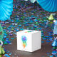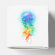 Large, iridescent, artistically drawn, bright jellyfish, with long tentacles on white, painted over with multicolored watercolor background. Rainbow jellyfish.
