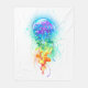 Large, iridescent, artistically drawn, bright jellyfish, with long tentacles on white, painted over with multicolored watercolor background. Rainbow jellyfish.