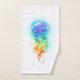 Large, iridescent, artistically drawn, bright jellyfish, with long tentacles on white, painted over with multicolored watercolor background. Rainbow jellyfish.