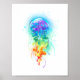 Large, iridescent, artistically drawn, bright jellyfish, with long tentacles on white, painted over with multicolored watercolor background. Rainbow jellyfish.