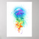 Large, iridescent, artistically drawn, bright jellyfish, with long tentacles on white, painted over with multicolored watercolor background. Rainbow jellyfish.