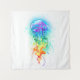 Large, iridescent, artistically drawn, bright jellyfish, with long tentacles on white, painted over with multicolored watercolor background. Rainbow jellyfish.