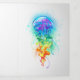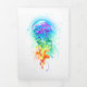 Large, iridescent, artistically drawn, bright jellyfish, with long tentacles on white, painted over with multicolored watercolor background. Rainbow jellyfish.