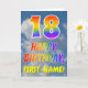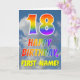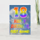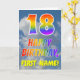 This fun and colourful 18th birthday greeting card design features a representation of a cloudy blue sky, along with a large number "18" and the message "HAPPY BIRTHDAY," having a rainbow spectrum inspired gradient pattern colouring, on the front. The front also features a custom recipient name. The inside features a custom birthday greeting message, or could perhaps be cleared and left blank if a message is to be written by hand instead. A customisable birthday card like this might be a fun way to send birthday wishes to somebody who is celebrating their eighteenth birthday. [~Z0000371]