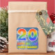 This vibrant, eye-catching, and exciting birthday-themed sticker design features a blue sky with clouds pattern background, a large number "20" and "HAPPY BIRTHDAY," both having a multicolored rainbow spectrum inspired gradient pattern, and a customisable name. Fun and colourful stickers like this might be used when wrapping presents being given in celebration of somebody’s twentieth birthday. [~Z0000374]