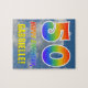This eye-catching, vibrant, and fun birthday-themed puzzle design features a blue sky with clouds pattern background, a large number "50" and "HAPPY BIRTHDAY," both having a multicolored rainbow spectrum inspired gradient pattern, and a customisable name. A colourful, caring, and editable birthday puzzle like this might be a fun way to send birthday wishes to somebody who is celebrating their 50th birthday. [~Z0000375]