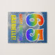 This exciting, fun, and vibrant birthday themed puzzle design features a blue sky with clouds pattern background, a large number "65" and "HAPPY BIRTHDAY," both having a multicolored rainbow spectrum inspired gradient pattern, and a personalised name. A colourful, caring, and customised birthday puzzle like this might be a fun way to send a birthday greeting in celebration of somebody’s 65th birthday. [~Z0000375]